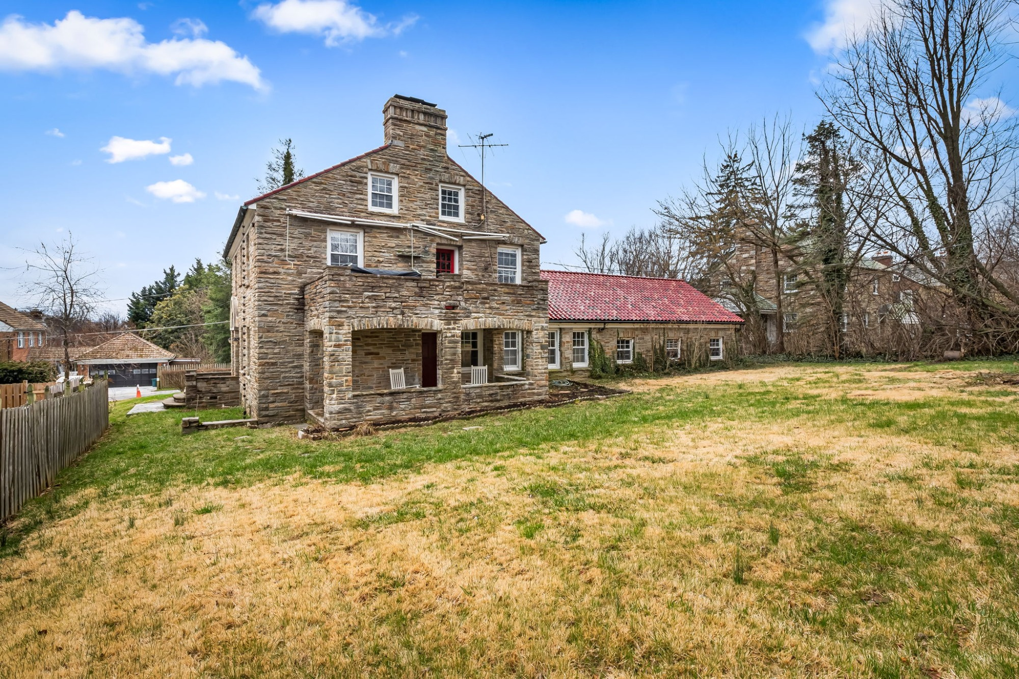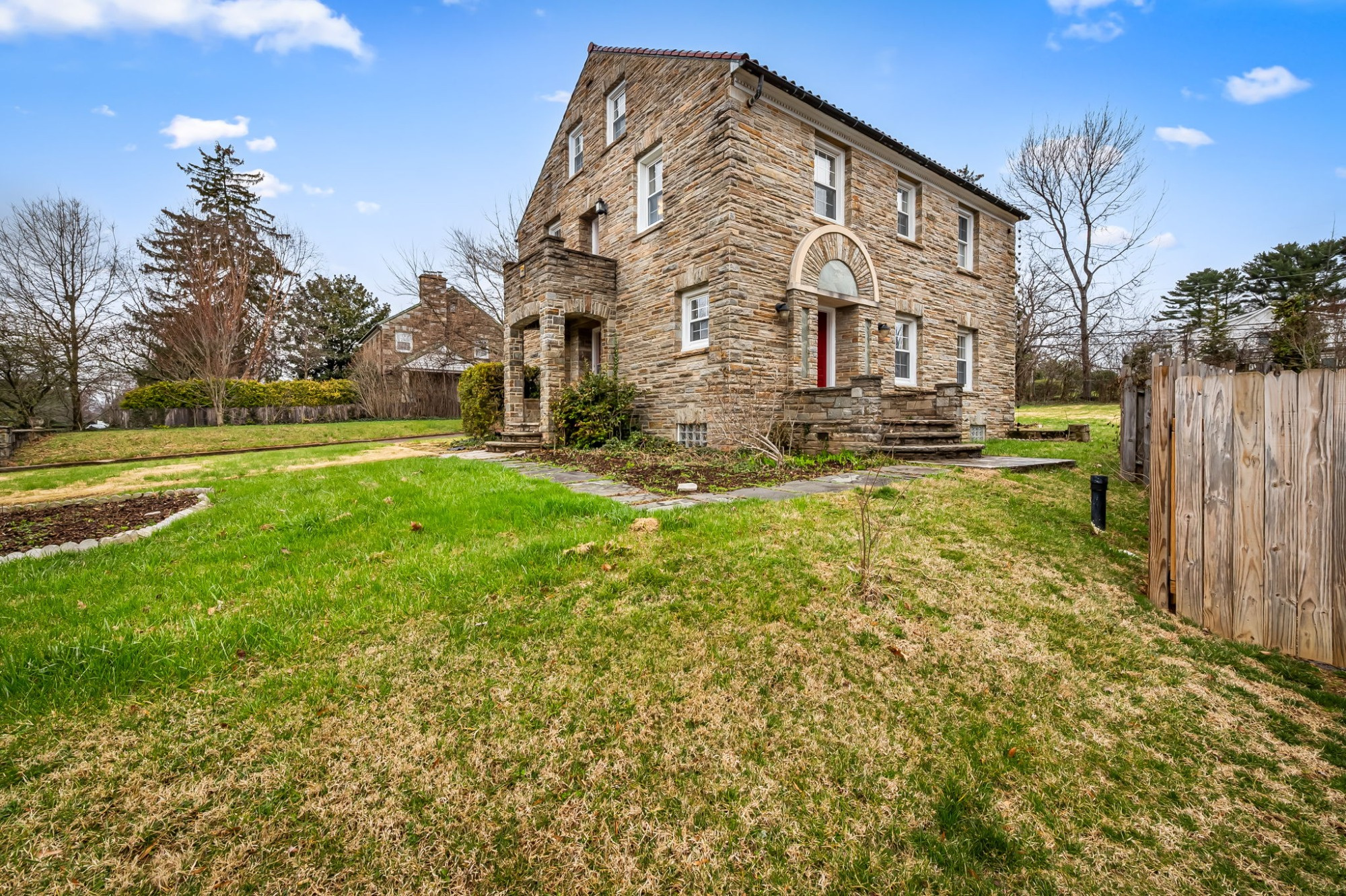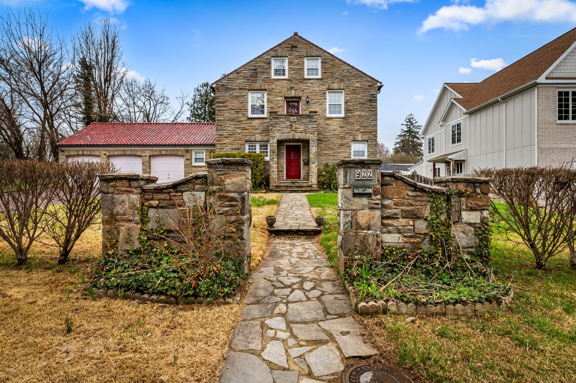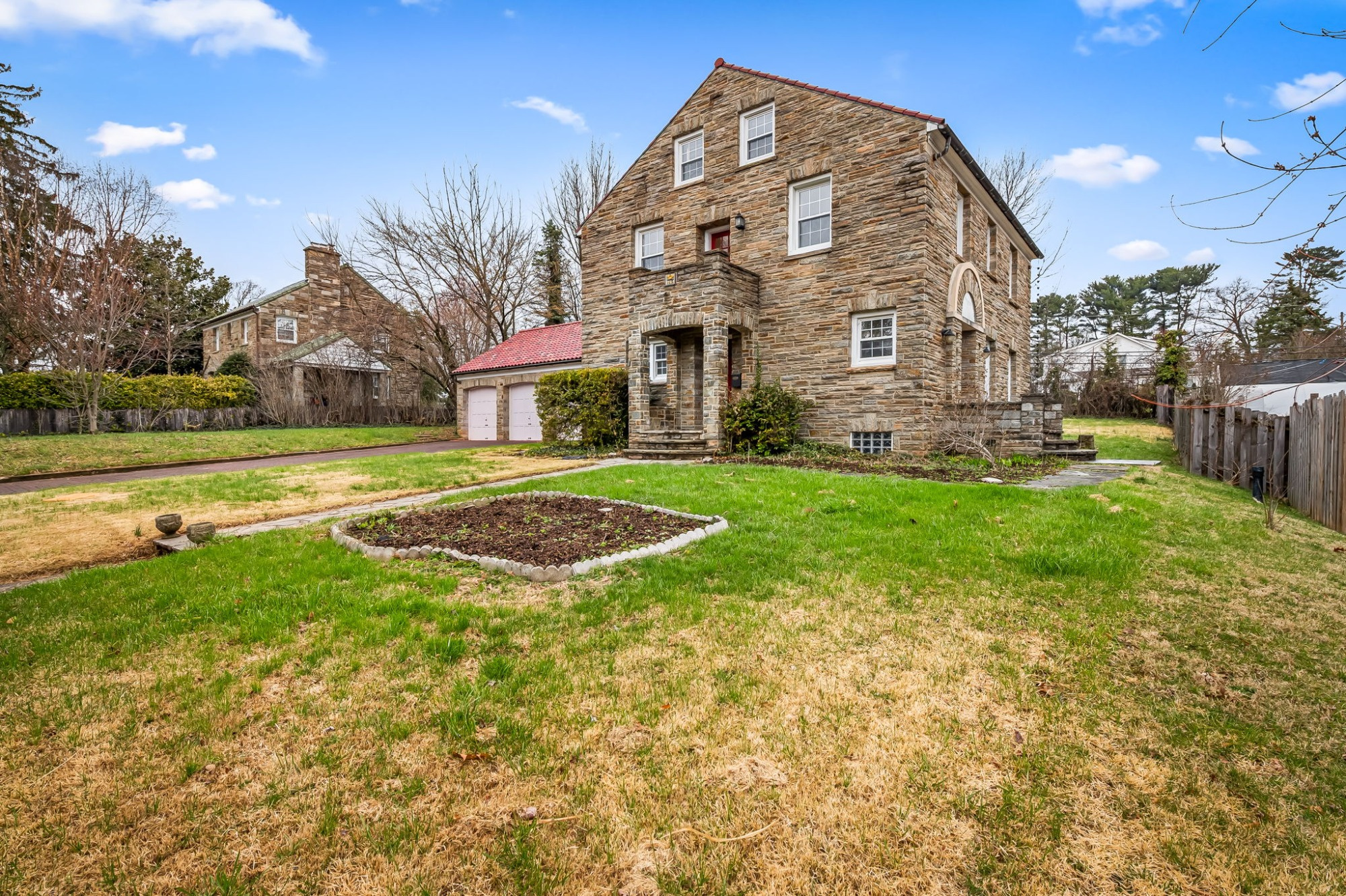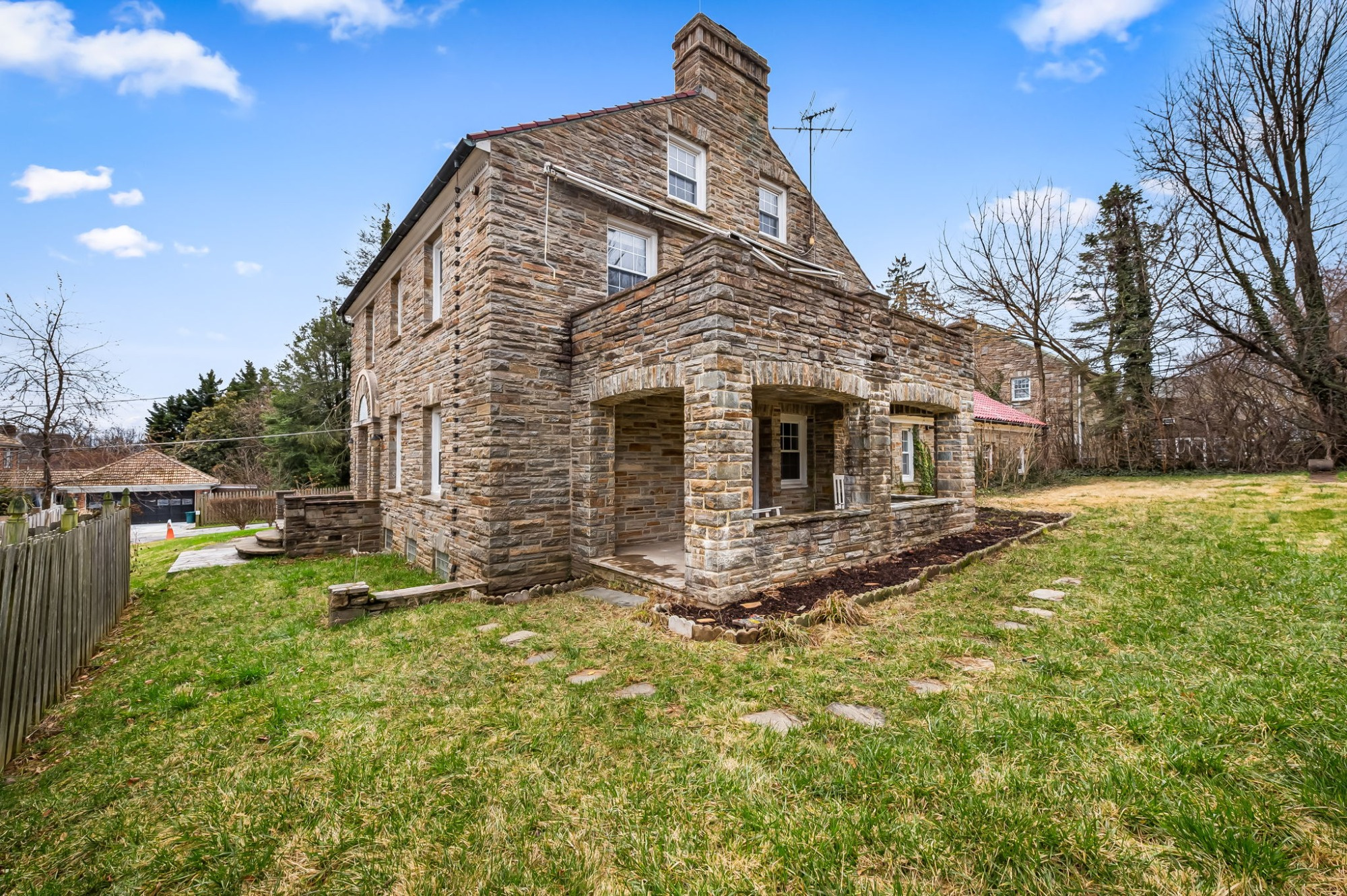 . The stone house is calling you home! It is the one you have admired for years. Constructed in 1941 of the finest of materials, 922 Fairway Drive in Towson's Knollwood (actually called Rodgers Forge Summit) neighborhood. The home feels like a castle, with high interior ceilings. mahogany doors, and solid construction. The parquet floor on the main level is mounted to a concrete subflooring, creating well-insulated spaces and keeping the house cool in the summer. There are surprises at every turn--the main floor family room could be the fourth bedroom, the lower level is finished with room for a pool table, and the living room and dining room are well-proportioned. Enter the covered back porch from the dining room or its rooftop deck from the Second bedroom. The primary bedroom features a walk-in closet and an original tiled bathroom with the cutest flamingoes and fish patterns. The other two bedrooms on this level are good sized, and the hall bath features the original seagull tile. Outside, find a gigantic yard complete with gazebo, patios, and more. The stone construction is original, and the house actually faced Stevenson Lane many years ago, so the back porch was originally on the side of the house. The tiled roof was replaced about 17 years ago and should last for close to 100 years. Expand the house into a portion of the three-car garage if you need extra room. Or finished the huge attic, which has four windows already in place.