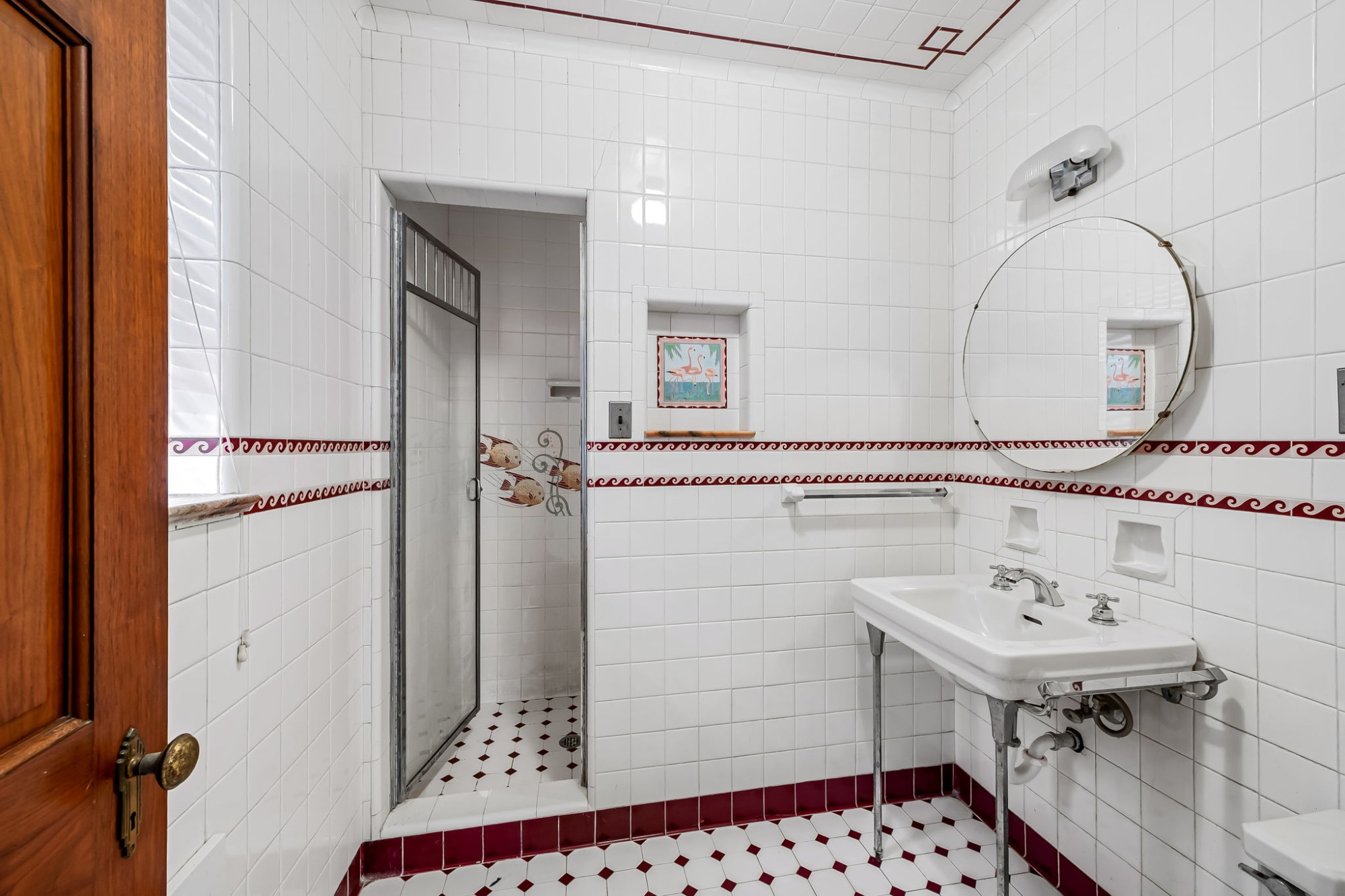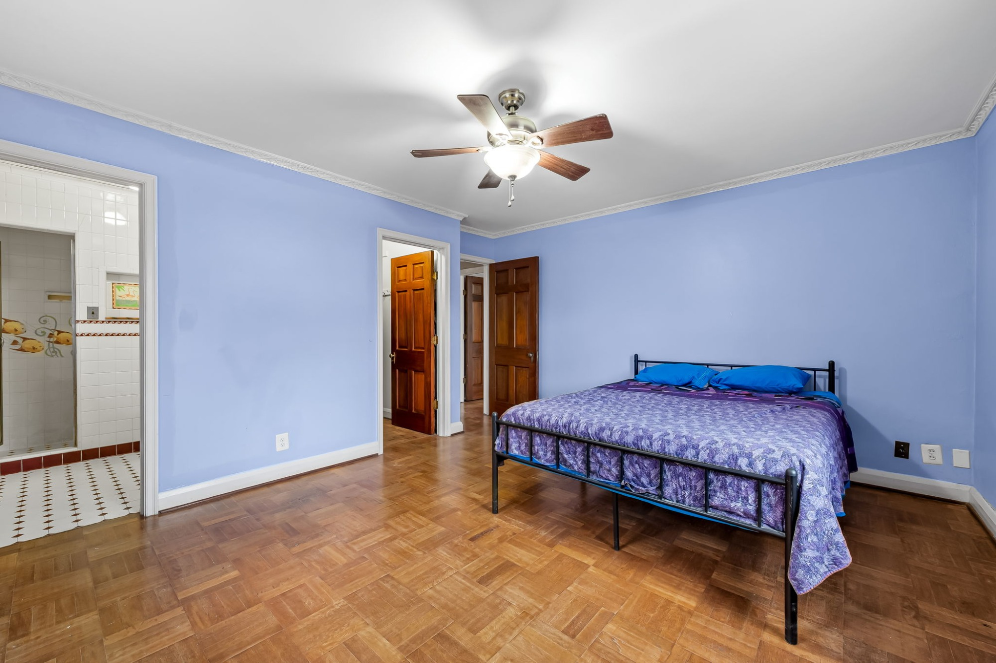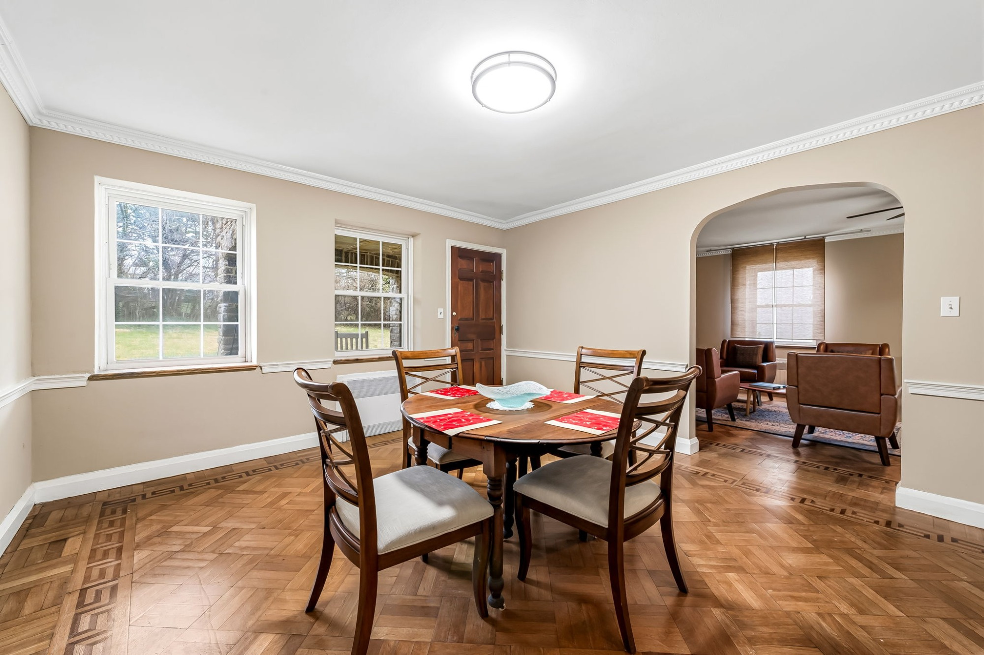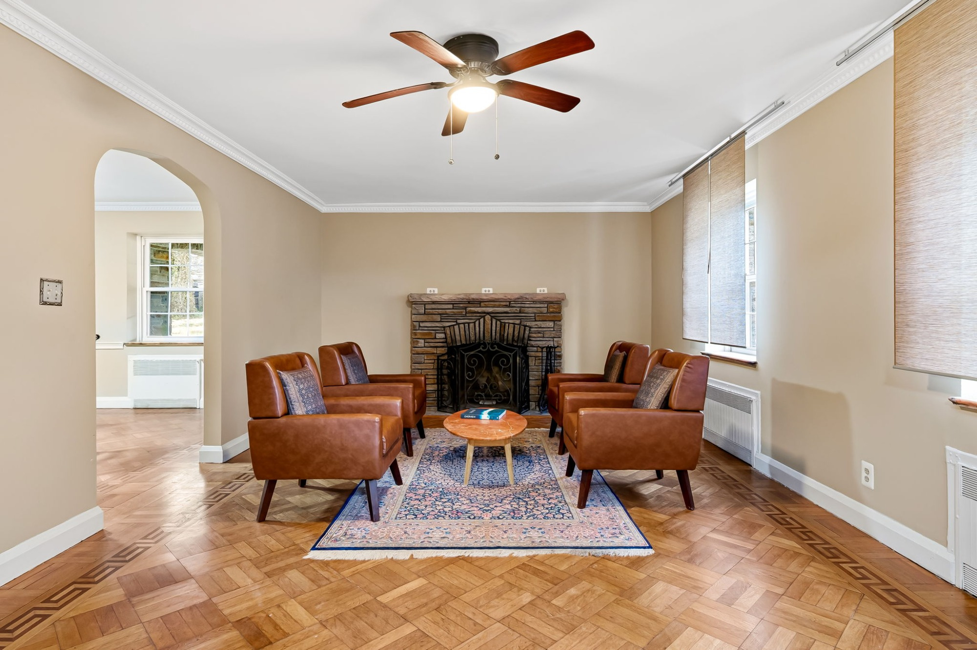 . The stone house is calling you home! It is the one you have admired for years. Constructed in 1941 of the finest of materials, 922 Fairway Drive in Towson's Knollwood (actually called Rodgers Forge Summit) neighborhood. The home feels like a castle, with high interior ceilings. mahogany doors, and solid construction. The parquet floor on the main level is mounted to a concrete subflooring, creating well-insulated spaces and keeping the house cool in the summer. There are surprises at every turn--the main floor family room could be the fourth bedroom, the lower level is finished with room for a pool table, and the living room and dining room are well-proportioned. Enter the covered back porch from the dining room or its rooftop deck from the Second bedroom. The primary bedroom features a walk-in closet and an original tiled bathroom with the cutest flamingoes and fish patterns. The other two bedrooms on this level are good sized, and the hall bath features the original seagull tile. Outside, find a gigantic yard complete with gazebo, patios, and more. The stone construction is original, and the house actually faced Stevenson Lane many years ago, so the back porch was originally on the side of the house. The tiled roof was replaced about 17 years ago and should last for close to 100 years. Expand the house into a portion of the three-car garage if you need extra room. Or finished the huge attic, which has four windows already in place.