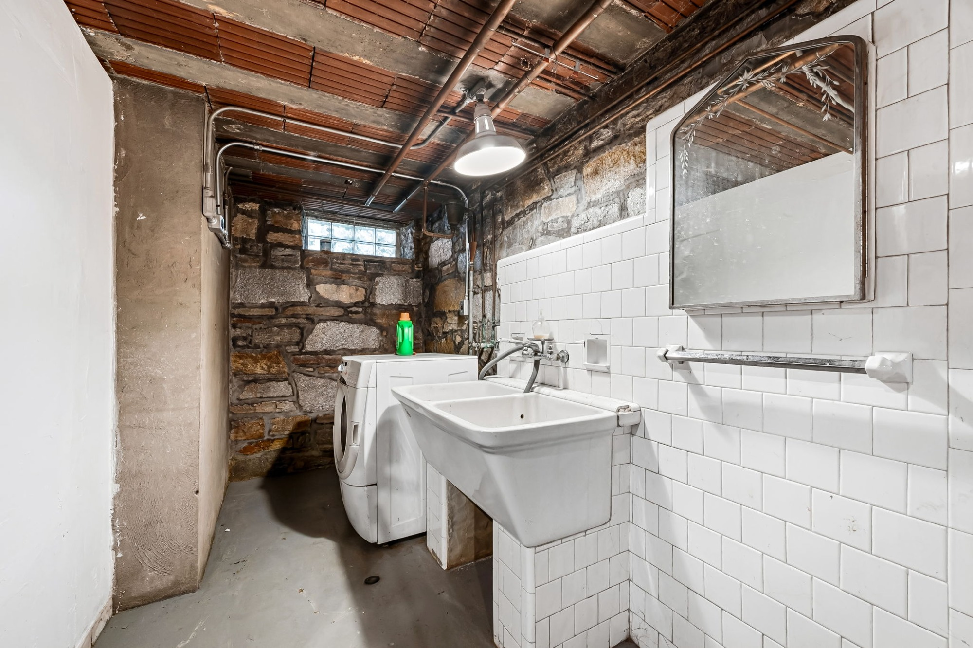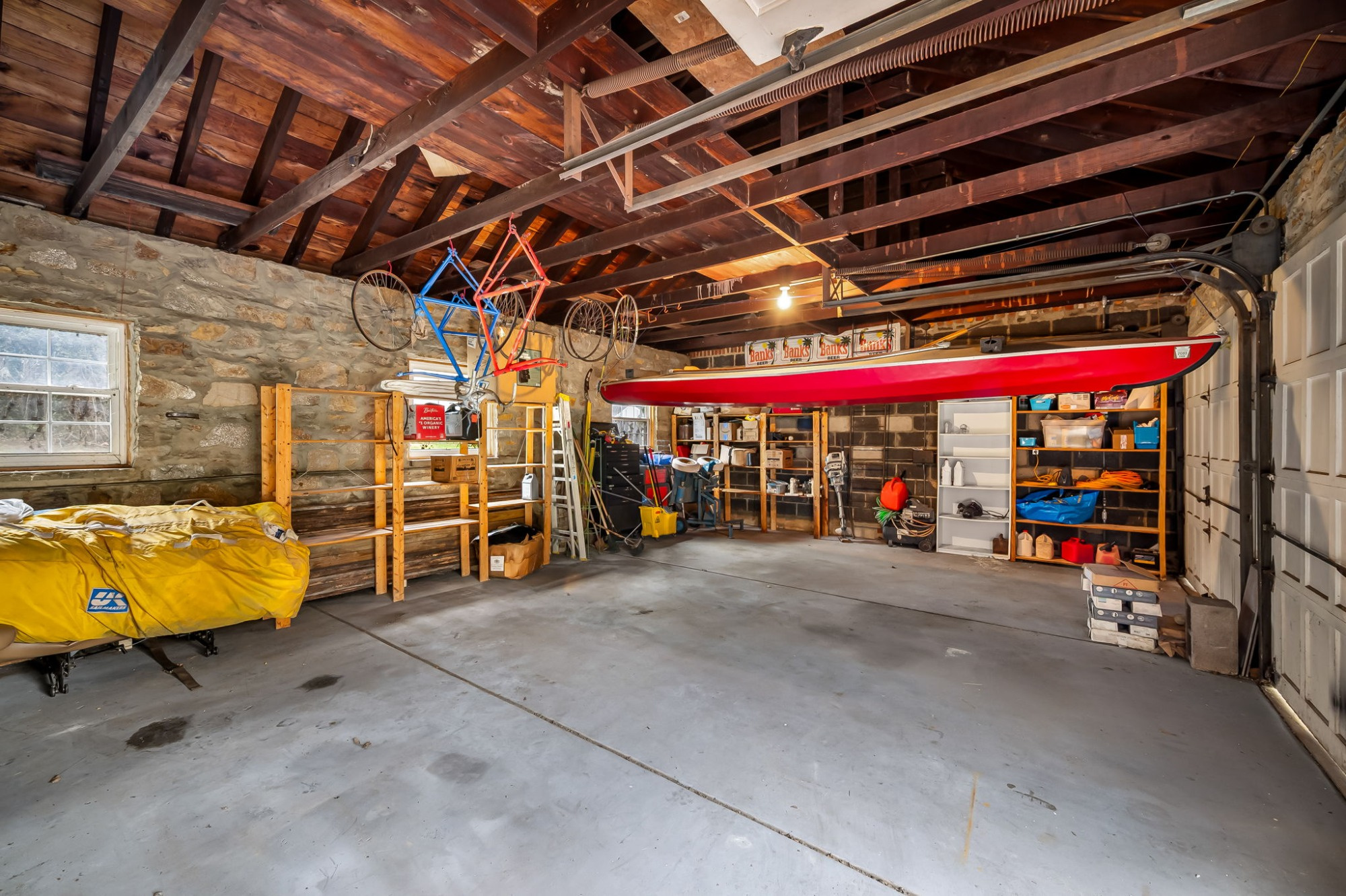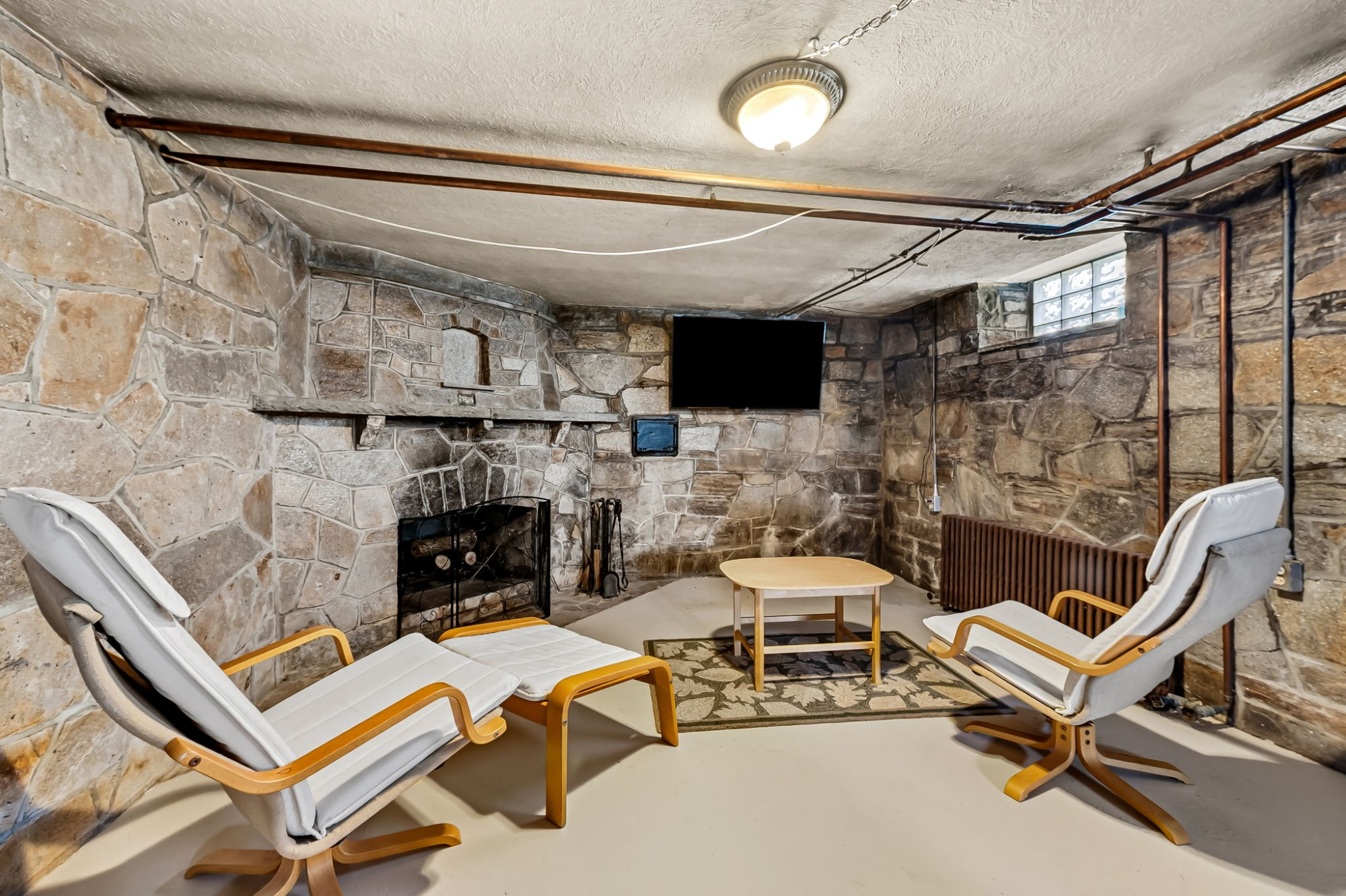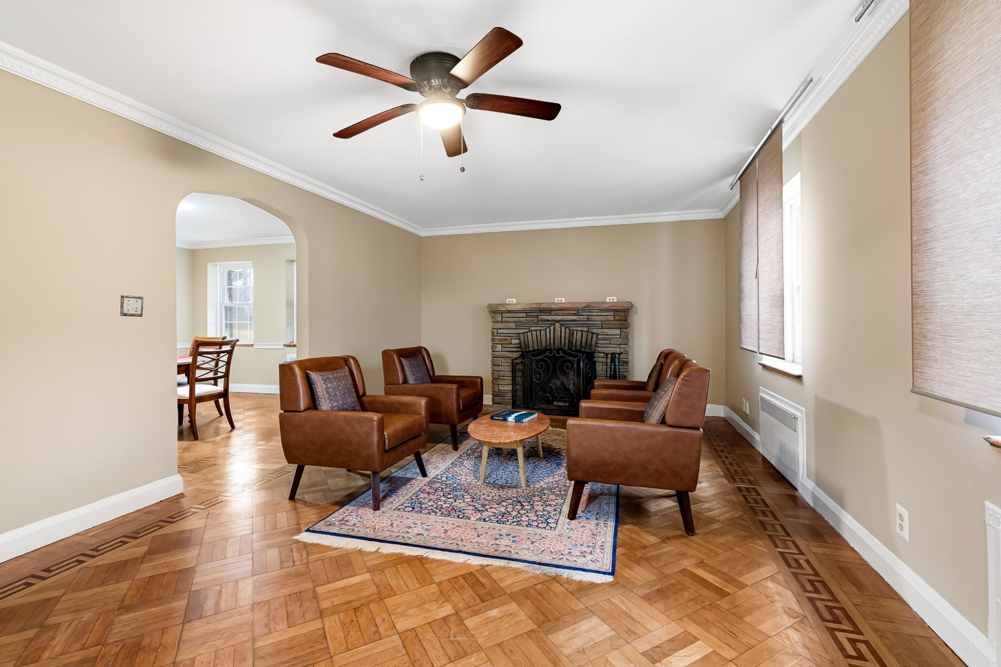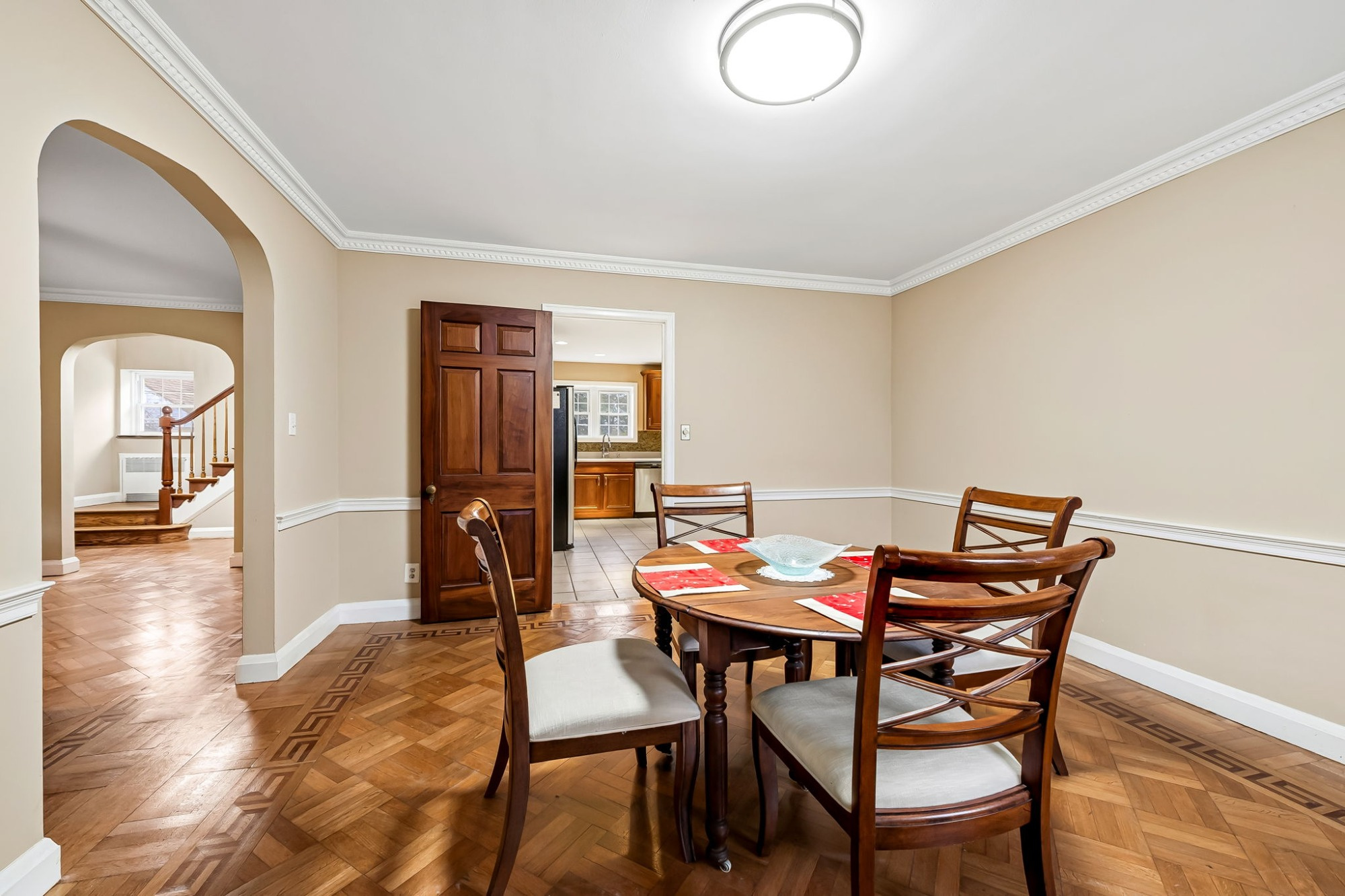 . The stone house is calling you home! It is the one you have admired for years. Constructed in 1941 of the finest of materials, 922 Fairway Drive in Towson's Knollwood (actually called Rodgers Forge Summit) neighborhood. The home feels like a castle, with high interior ceilings. mahogany doors, and solid construction. The parquet floor on the main level is mounted to a concrete subflooring, creating well-insulated spaces and keeping the house cool in the summer. There are surprises at every turn--the main floor family room could be the fourth bedroom, the lower level is finished with room for a pool table, and the living room and dining room are well-proportioned. Enter the covered back porch from the dining room or its rooftop deck from the Second bedroom. The primary bedroom features a walk-in closet and an original tiled bathroom with the cutest flamingoes and fish patterns. The other two bedrooms on this level are good sized, and the hall bath features the original seagull tile. Outside, find a gigantic yard complete with gazebo, patios, and more. The stone construction is original, and the house actually faced Stevenson Lane many years ago, so the back porch was originally on the side of the house. The tiled roof was replaced about 17 years ago and should last for close to 100 years. Expand the house into a portion of the three-car garage if you need extra room. Or finished the huge attic, which has four windows already in place.